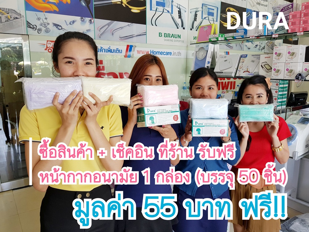 ช่วงนี้ฝุ่นเยอะ ที่ร้านแจกฟรีค่ะ หน้ากากอนามัย Dura 1 กล่องบรรจุ 50 ชิ้น ปกติราคา 55 บาท ลูกค้าที่ซื้อสินค้าทุกรายการที่ราคาไม่ต่ำกว่า 500 บาท และ CHECK IN เป็นสาธารณะที่ "ศูนย์เครื่องมือแพทย์หาดใหญ่" รับเลยฟรีๆ หน้ากากอนามัย Dura 1 กล่องบรรจุ 50 ชิ้น ราคา 55 บาทค่ะ